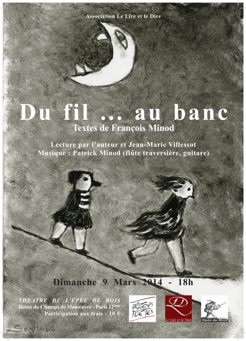Du fil … au banc Textes de François Minod Lecture par l’auteur et Jean-Marie Villessot Musique : Patrick Minod (flûte traversière, guitare) Dimanche 9 Mars 2014 – 18h THEATRE DE L’ÉPEE DE BOIS Route du Champs de Manœuvre – Paris 12 Participation aux frais : 10 € Partager : Cliquer pour partager sur X(ouvre dans une nouvelle fenêtre) X Cliquez pour partager sur Facebook(ouvre dans une nouvelle fenêtre) Facebook J’aime chargement…